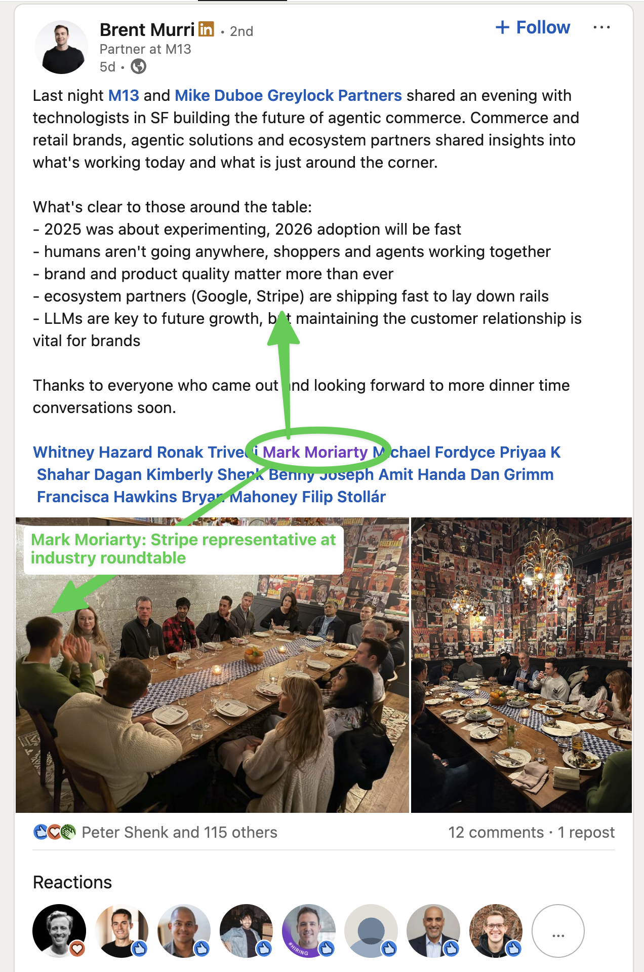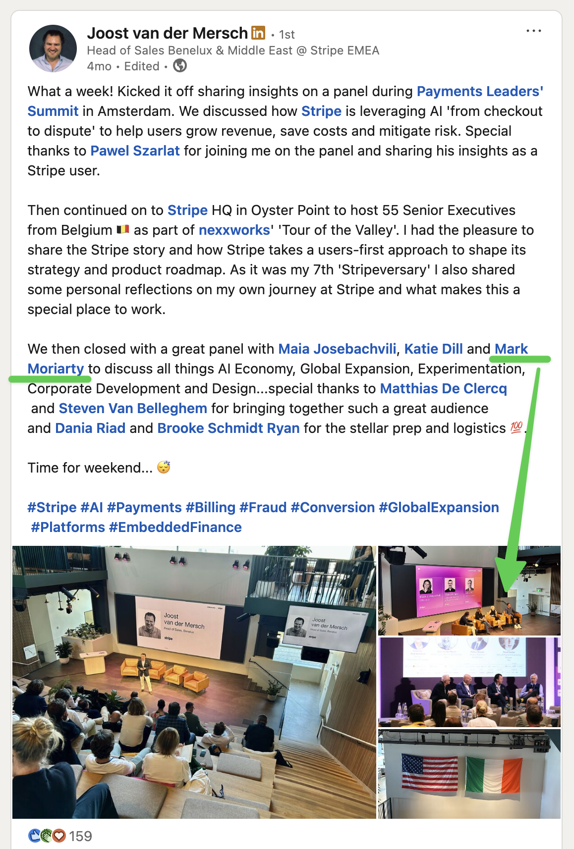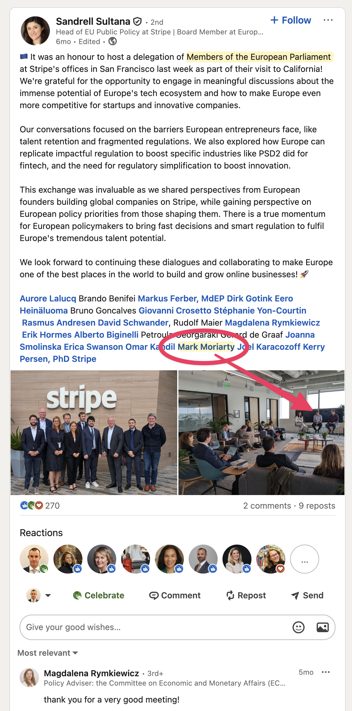 Mr Moriarty is often the designated Stripe spokesperson at key meetups with industry players. Here are some LinkedIn posts (from other people) in the past few months, tagging him as the sole Stripe rep, or one of a small number of senior Stripe spokespeople.