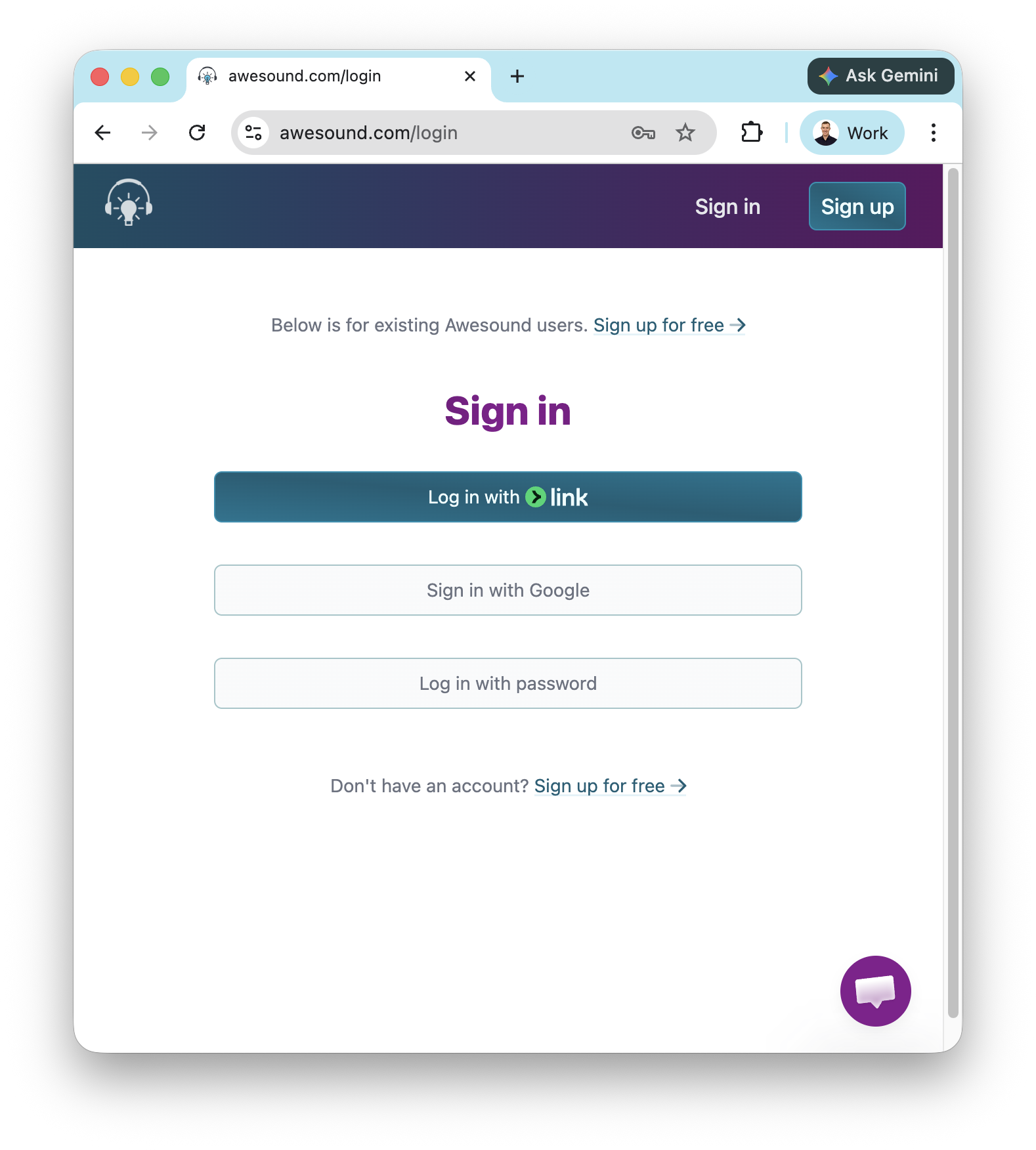 Above: screenshot from awesound.com/login. Note the “Log in with Link” option. This was a project that Mr Moriarty conceived from scratch, built the first prototype of (loginwithlink.com), and Awesound was one of the first websites to adopt this login option.