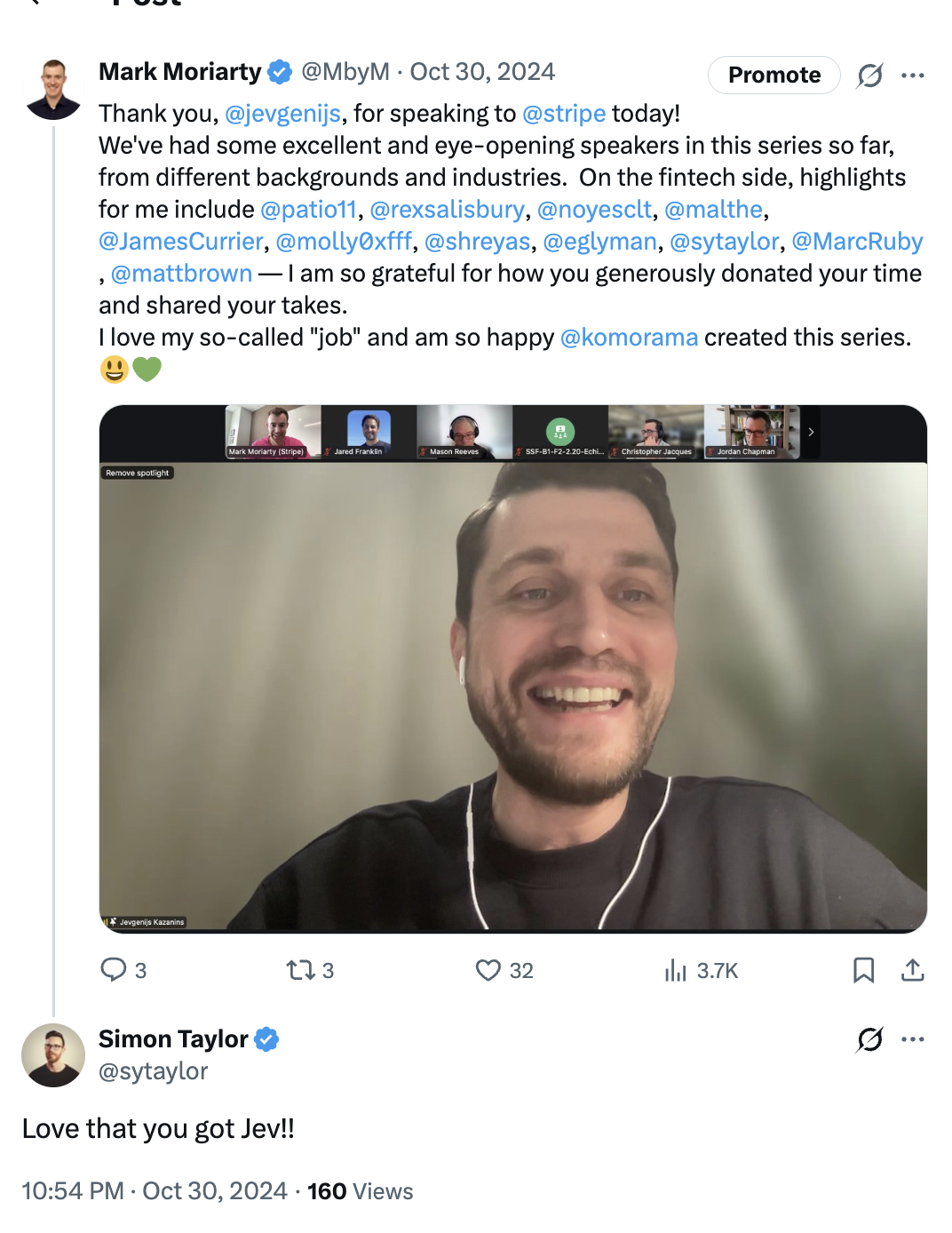 - Mr Moriarty runs an internal speaker series, where he interviews guests live on Zoom. Interviews are attended live by 100+ Stripe employees via Zoom, with many more catching the replay (shared only internally to Stripe employees). Mr Moriarty is a prominent public face of Stripe, liasing with prominent fintech writers (like Matt Brown, Simon Taylor, Jevgenijs), entrepreneurs (like Eric Glyman, co-founder of Ramp, now worth $32 billion), investors, and more.