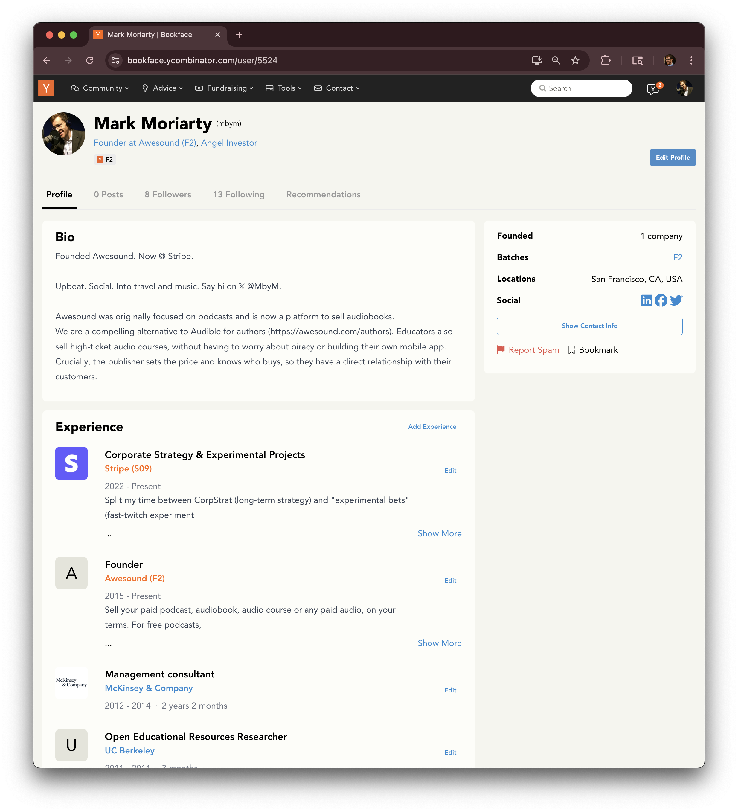 Mark Moriarty in Bookface - the closed ycombinator alumni network.png