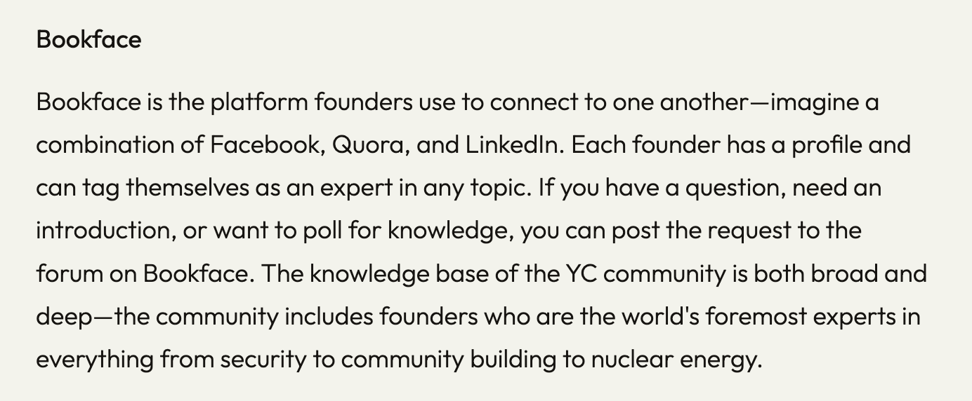 About Bookface, from https://www.ycombinator.com/about: about bookface.png