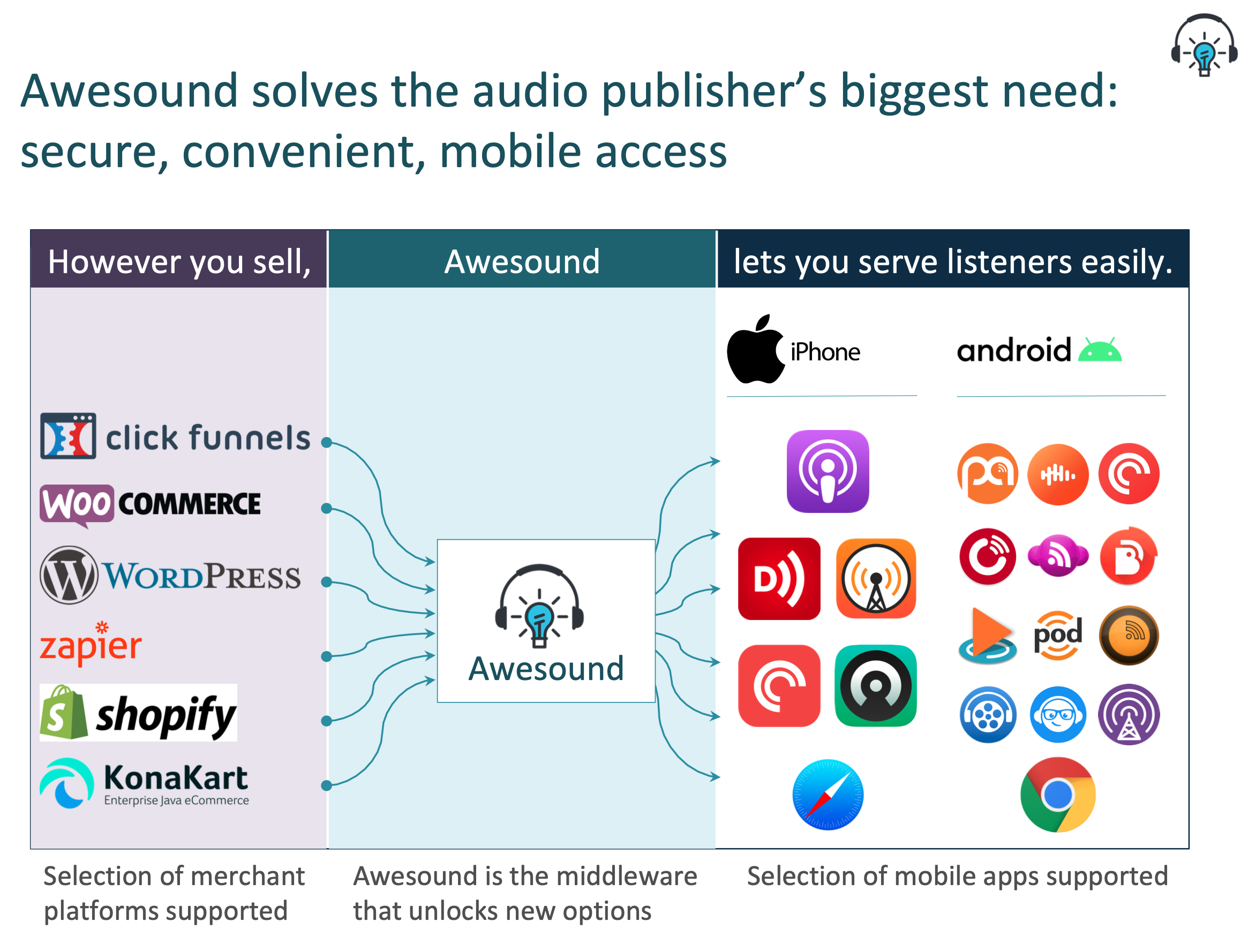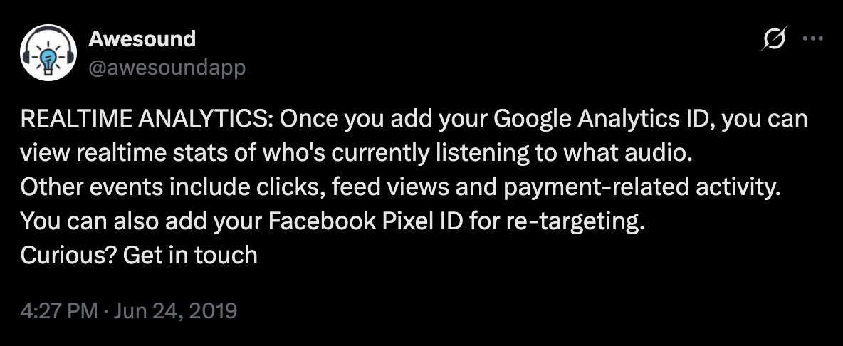 In 2019, Awesound was the first podcast platform to offer real-time analytics for web listeners, allowing podcasters to view how many listeners were currently listening: