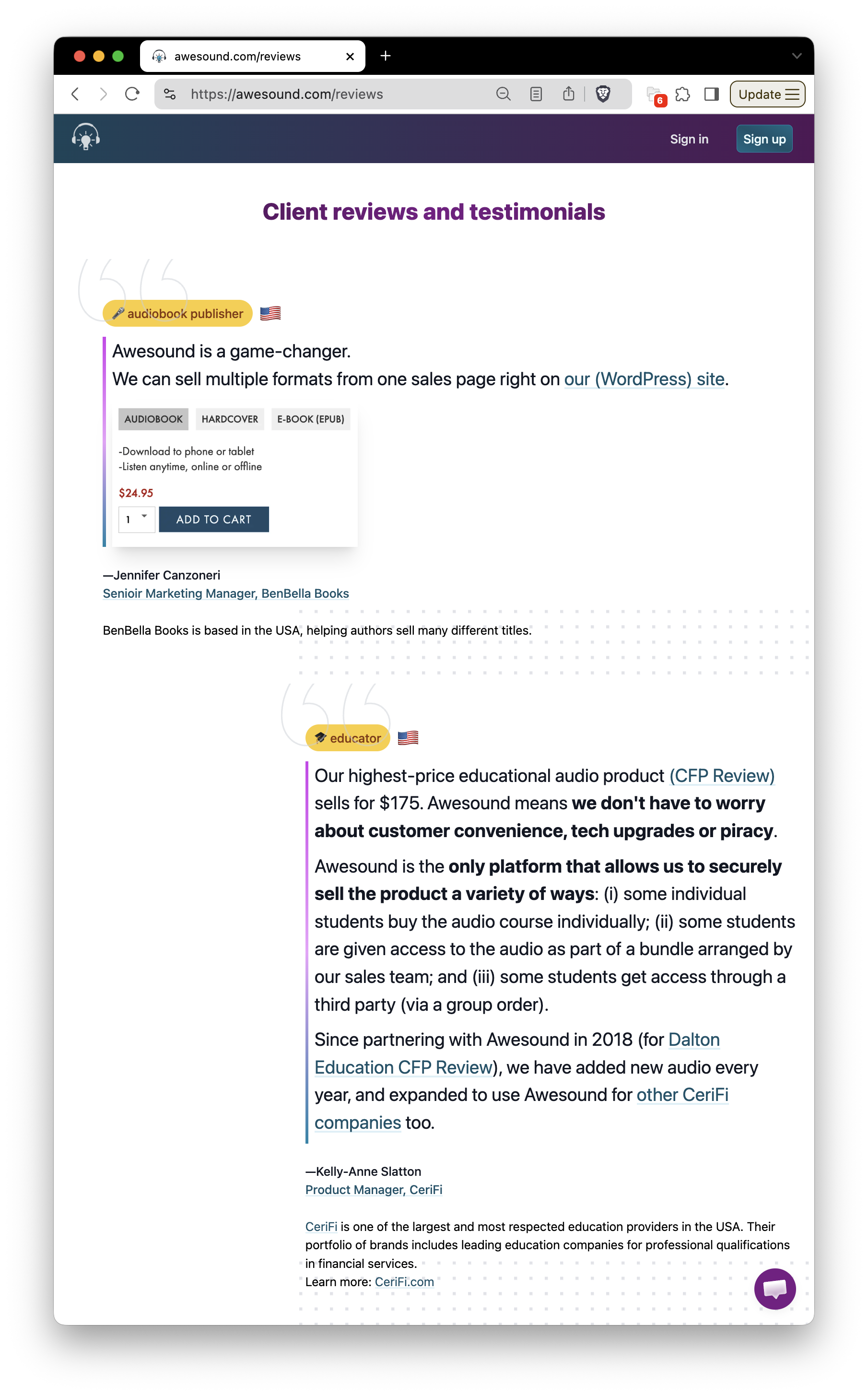 Draft letter from Kelly-Anne Slatton, CeriFi (started using Awesound in 2018) https://docs.google.com/document/d/1C21SGTmBSQfFqSYNO5d8iT7uEsFxDqmzk8p3aT8Or5A