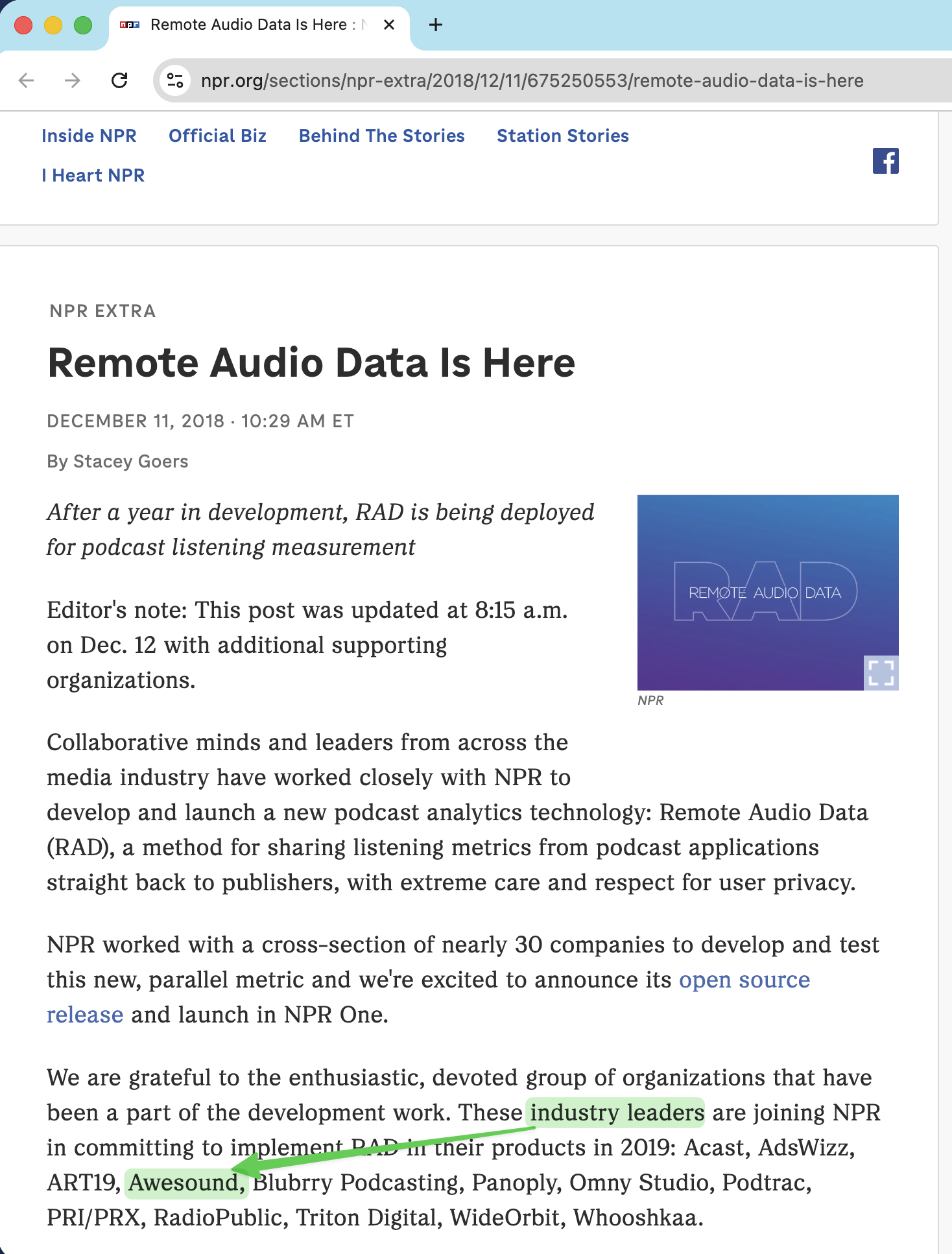 Collaborative minds and leaders from across the media industry have worked closely with NPR to develop and launch a new podcast analytics technology: Remote Audio Data (RAD). We are grateful to the enthusiastic, devoted group of organizations that have been a part of the development work. These industry leaders are joining NPR in committing to implement RAD in their products in 2019: Acast, AdsWizz, ART19, Awesound, Blubrry Podcasting [and eight others].