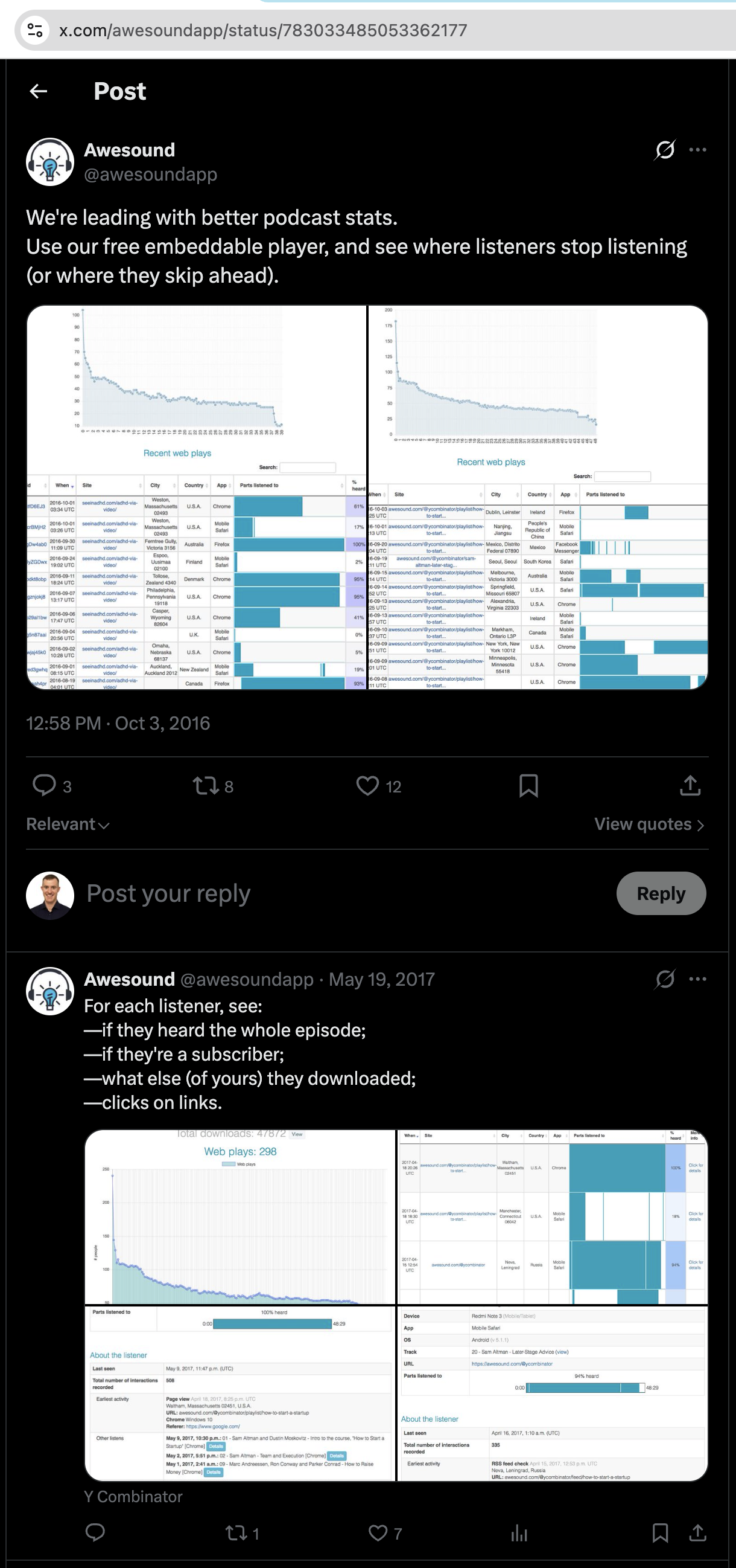 In 2016, Awesound was the first podcast host to show listener drop-off. Not just “number of downloads”, but showing where in an episode listeners dropped off (or skipped ahead).