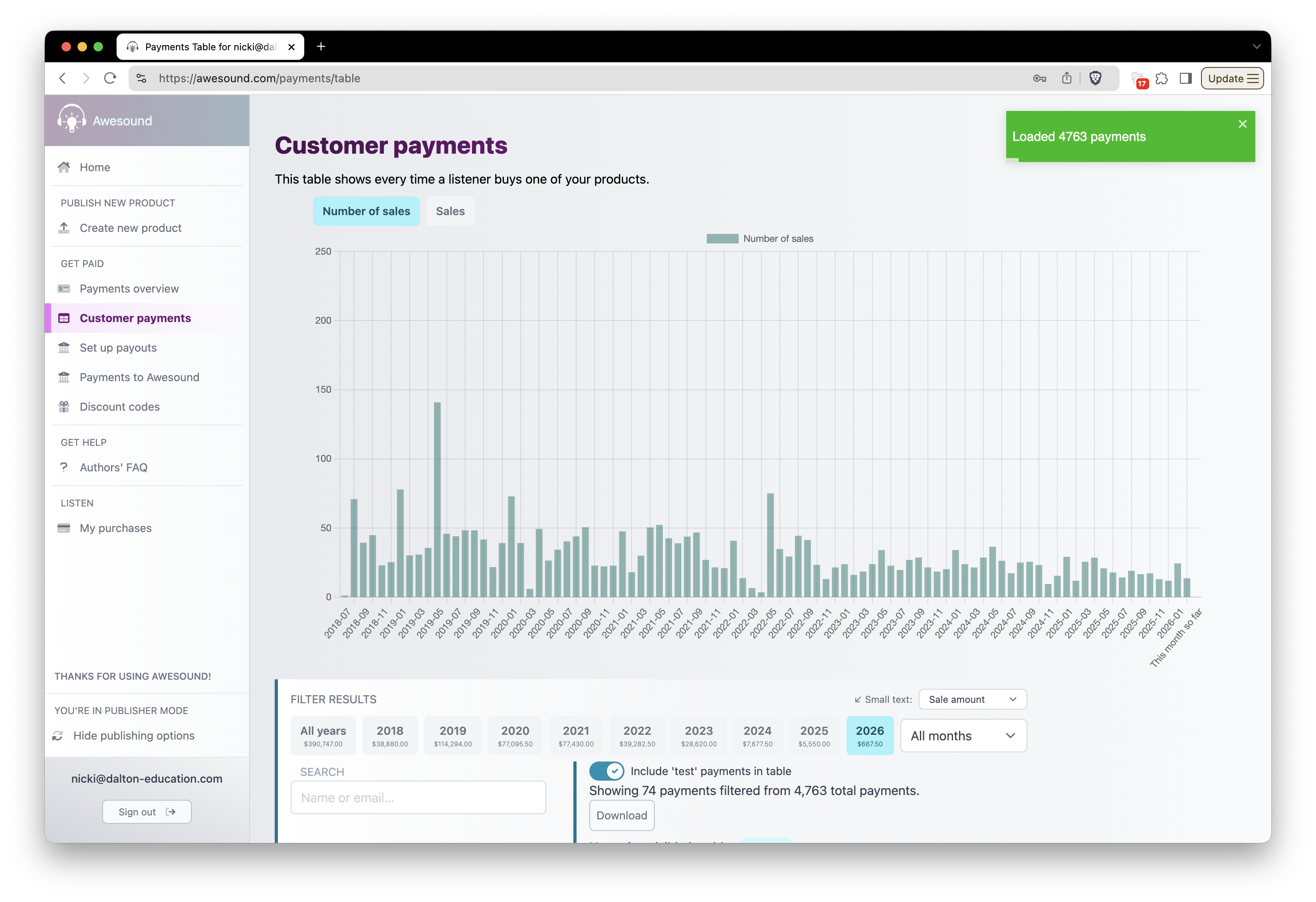 That publisher has almost 5,000 sales fulfilled by Awesound (roughly half through Awesound and half through their own website and channels)