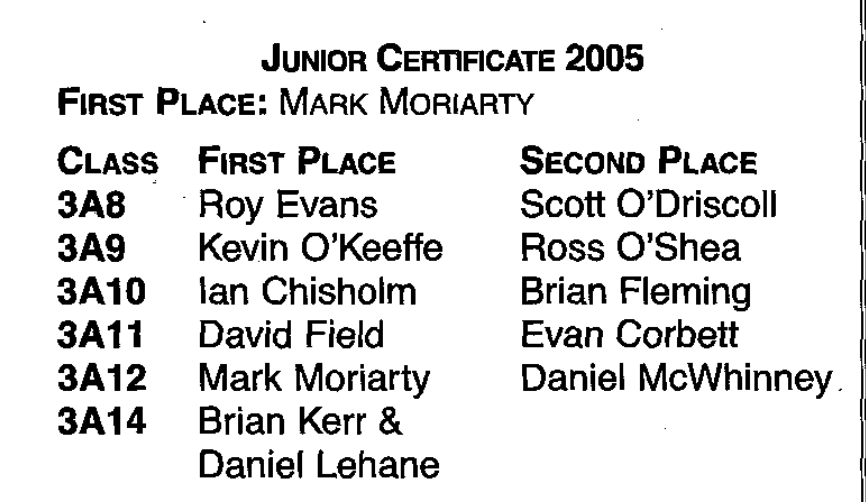 - Junior Certificate 2005: Mr Moriarty achieved top marks in the country (no student achieved higher marks). Mr. Moriarty was one of of just five students in the country to score elevent A grades at higher level. Out of approximately 56,000 students who took the “Junior Certificate” exam in 2005, this put him in the top 0.009% of students in Ireland (less than 1% of 1%).