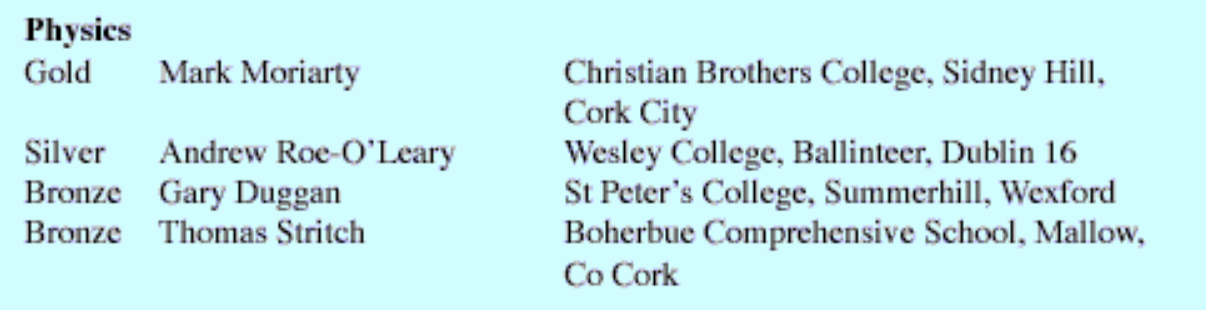 - 2007: Mr Moriarty won first place in the Irish Physics Olympiad. This is the main competition, across all 32 counties of the island of Ireland, for pre-university students. It also forms the basis of selection for the International Physics Olympiad. (The top ~12 students are invited to additional training and tests, to chose 4-5 students to represent Ireland at the International Physics Olympiad.)