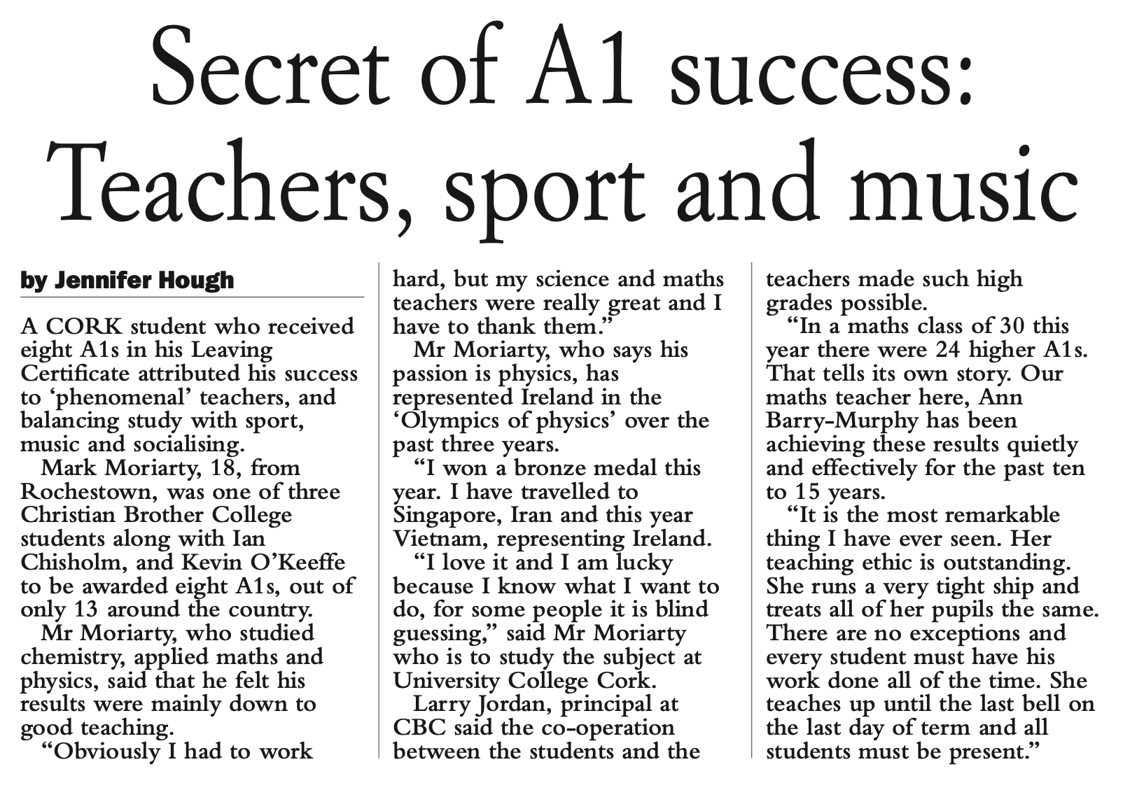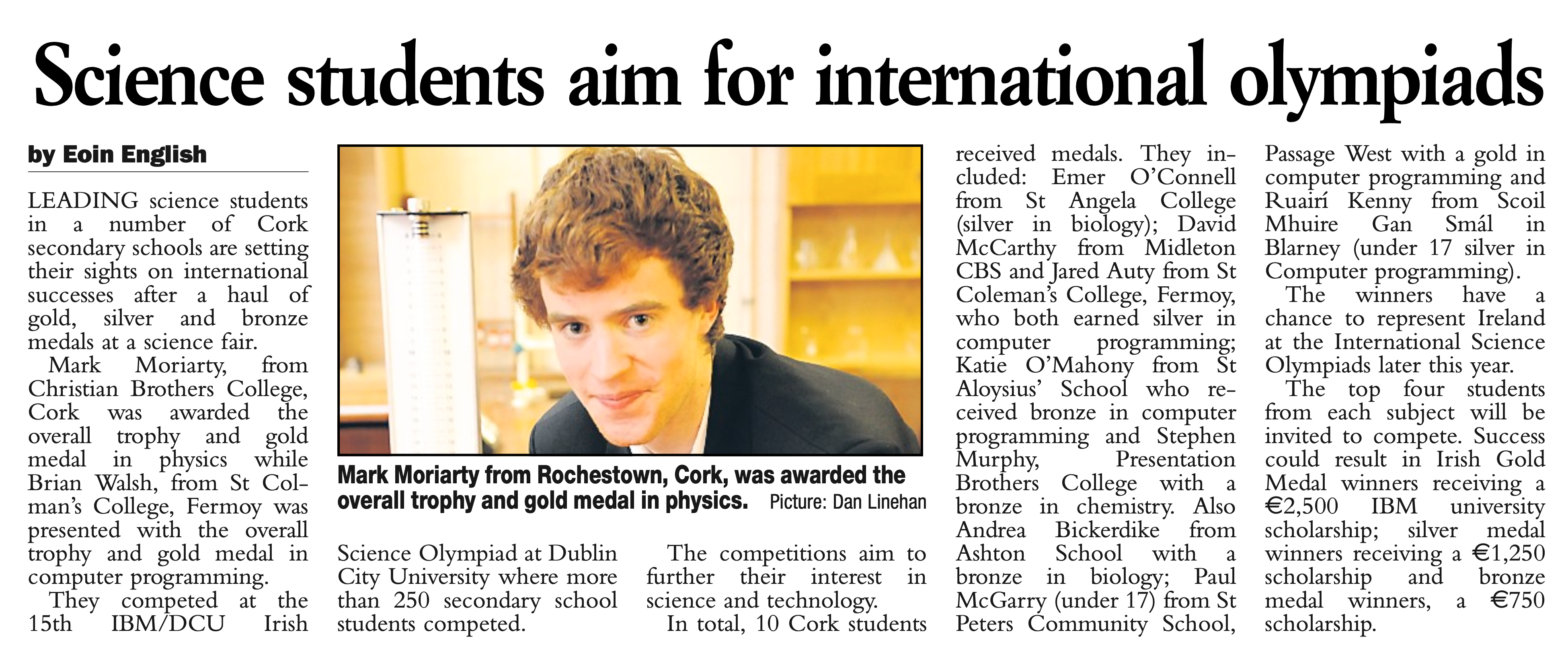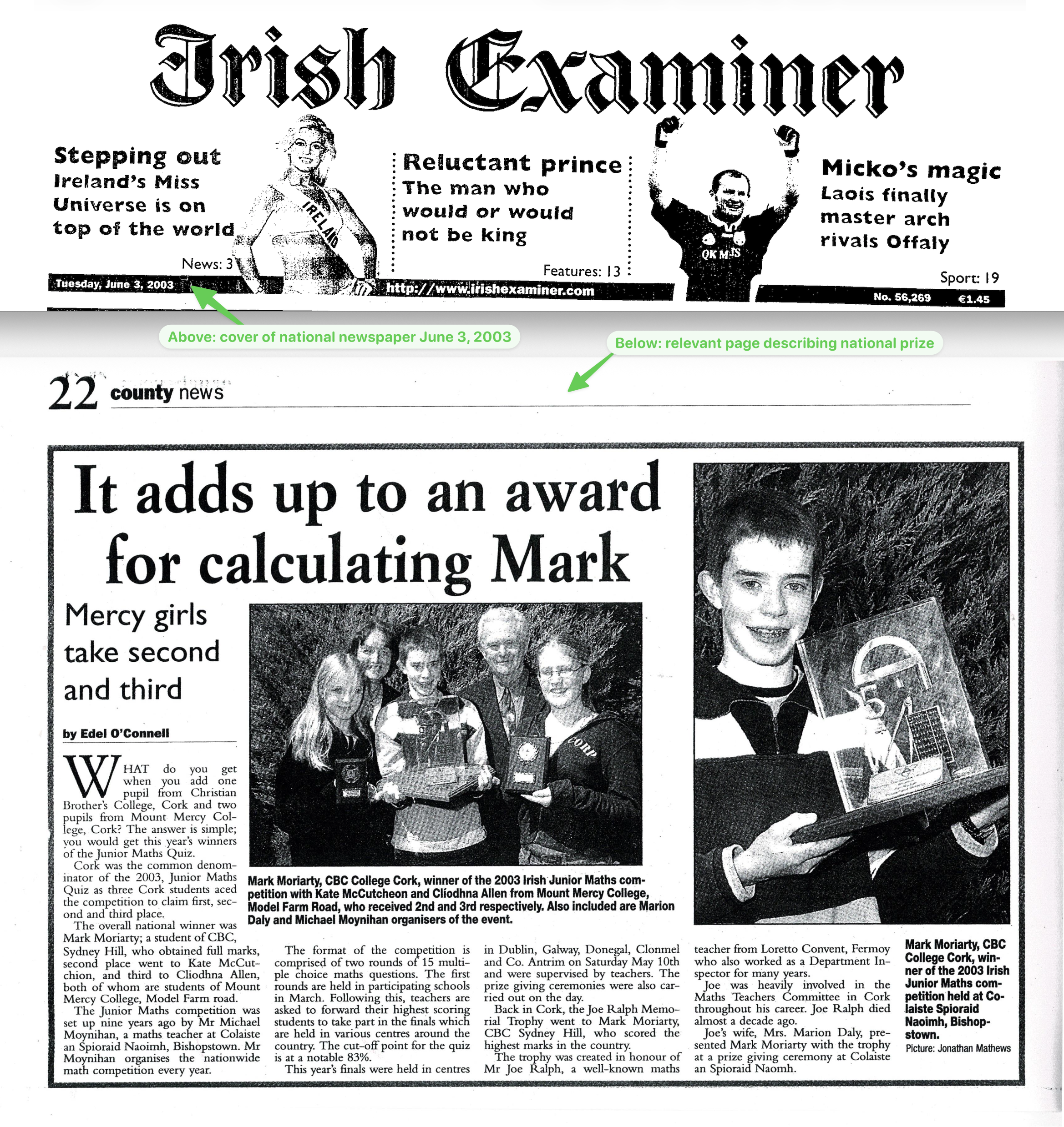 The front page of that paper also mentioned Mark Moriarty, since the top performers in the national exams attract press coverage: