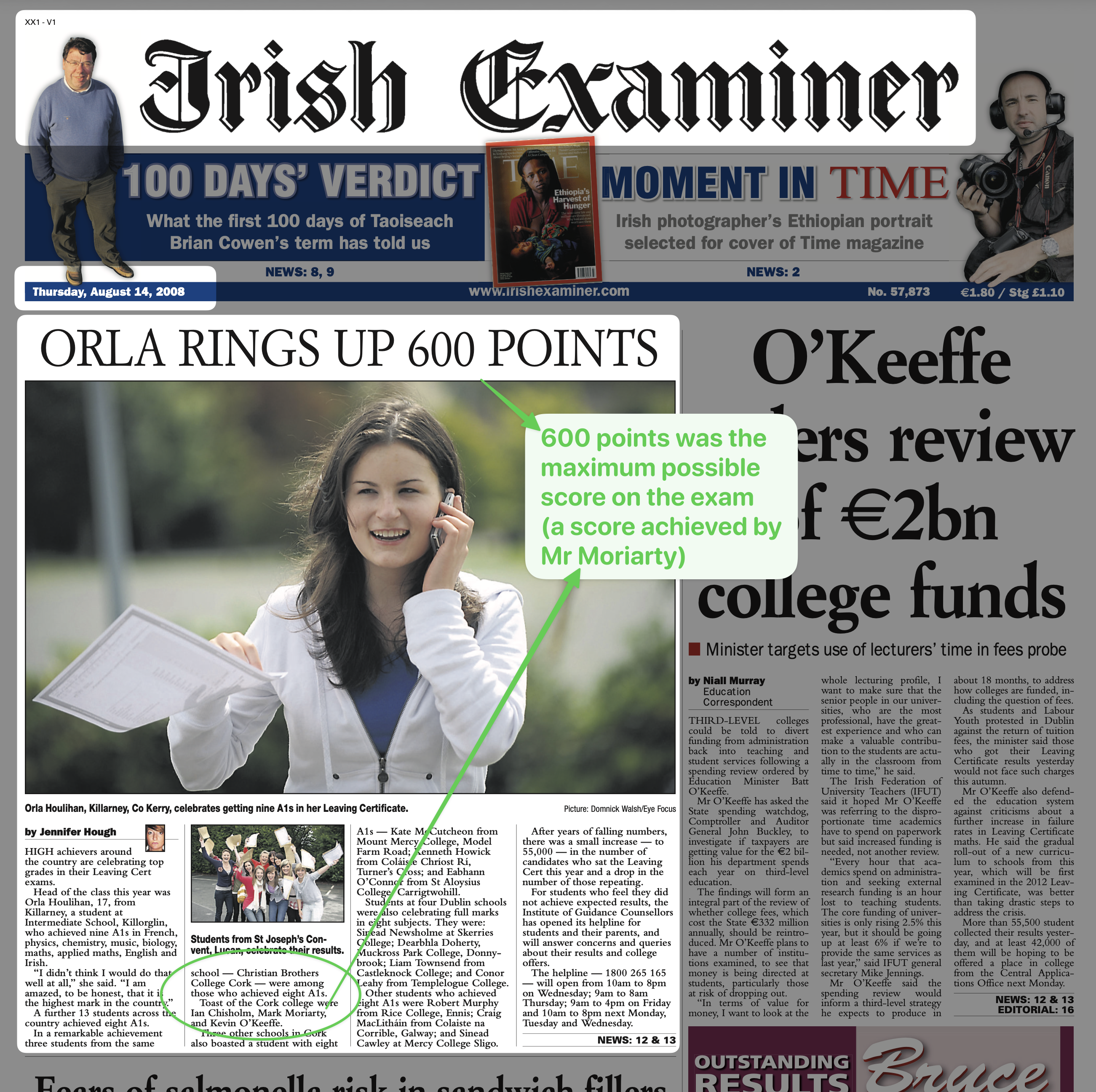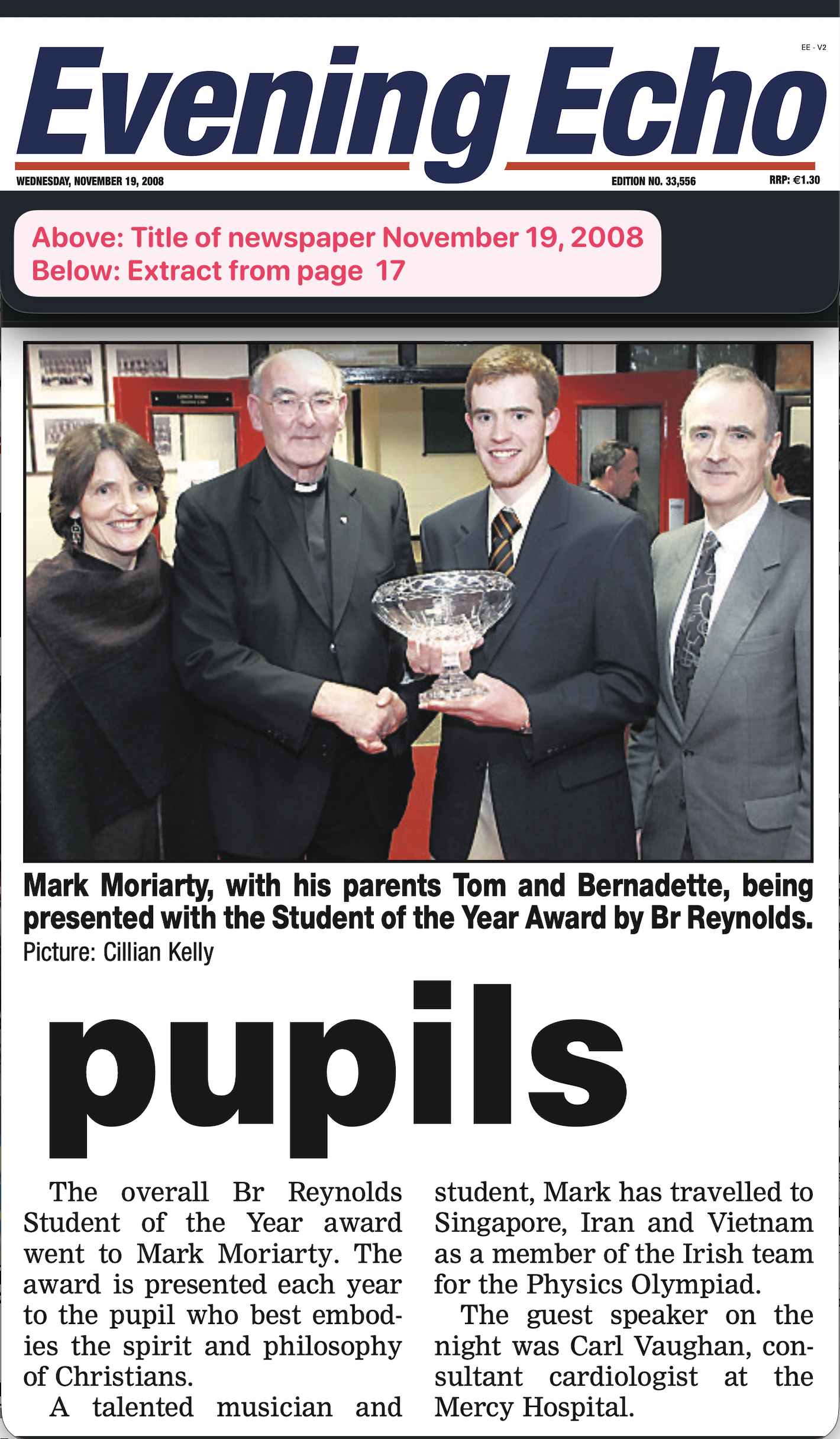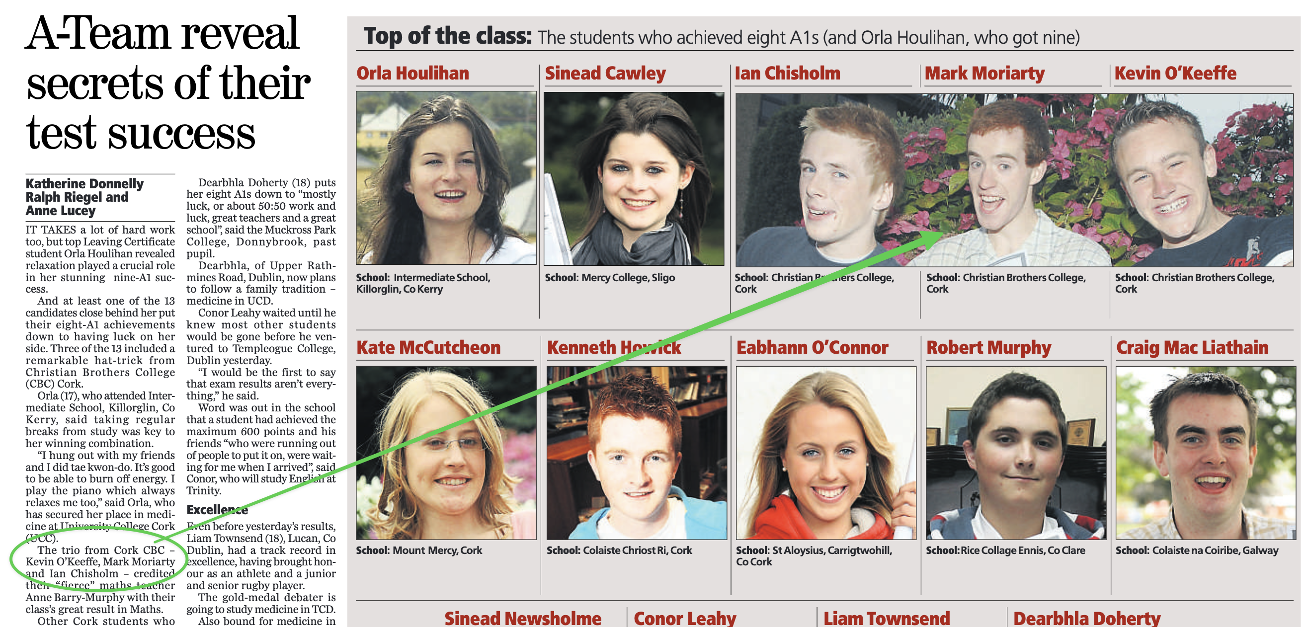The front page of that paper also mentioned Mark Moriarty, since the top performers in the national exams attract press coverage: