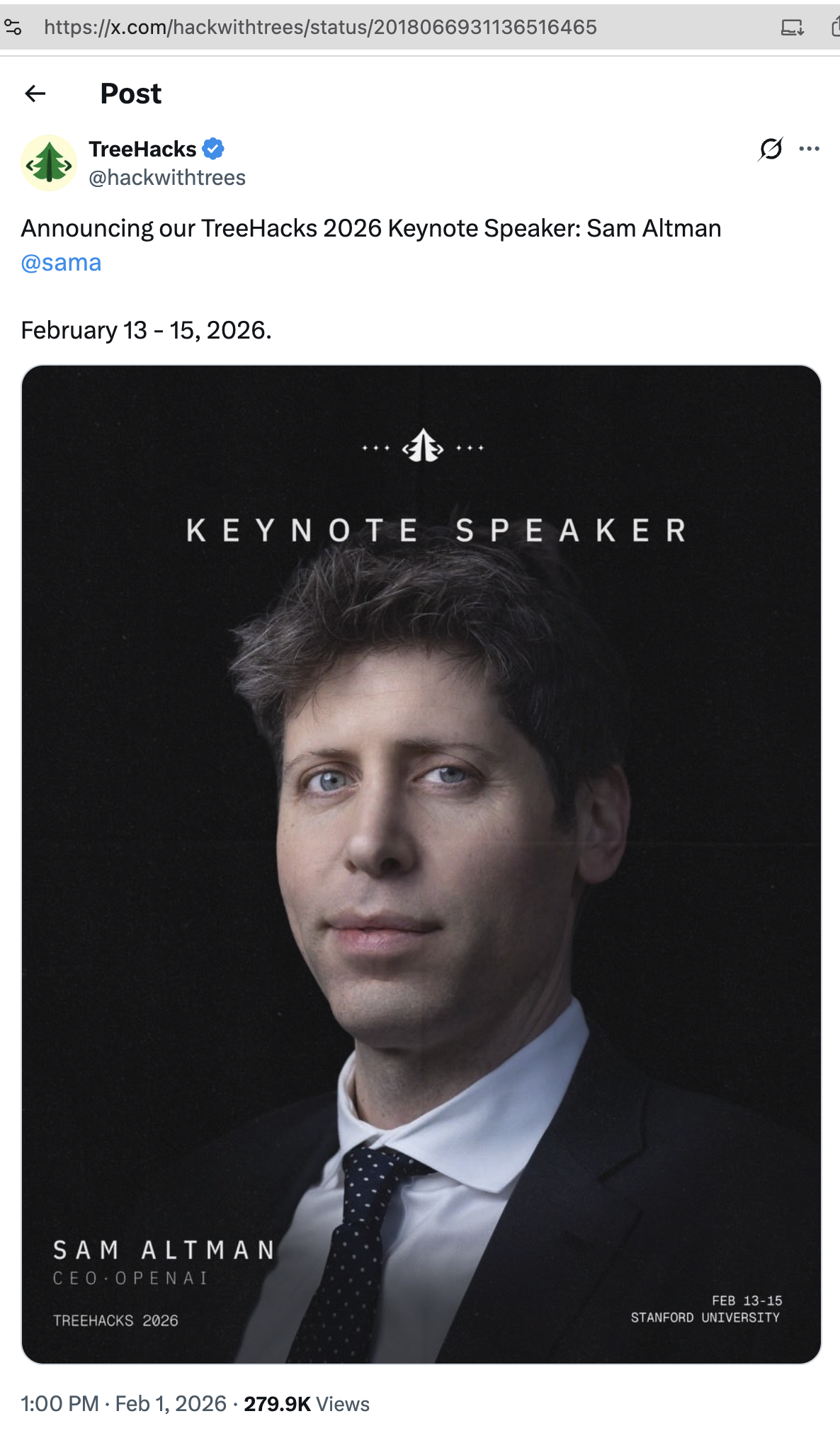 - https://x.com/hackwithtrees This is an extremely selective and prestigious hackathon. Over a thousand attendees will compete for over $500,000 worth of prizes. This year’s speakers and judges included Sam Altman (CEO of OpenAI, the creator of ChatGPT), Garry Tan (CEO of YCombinator) and Mark Moriarty.