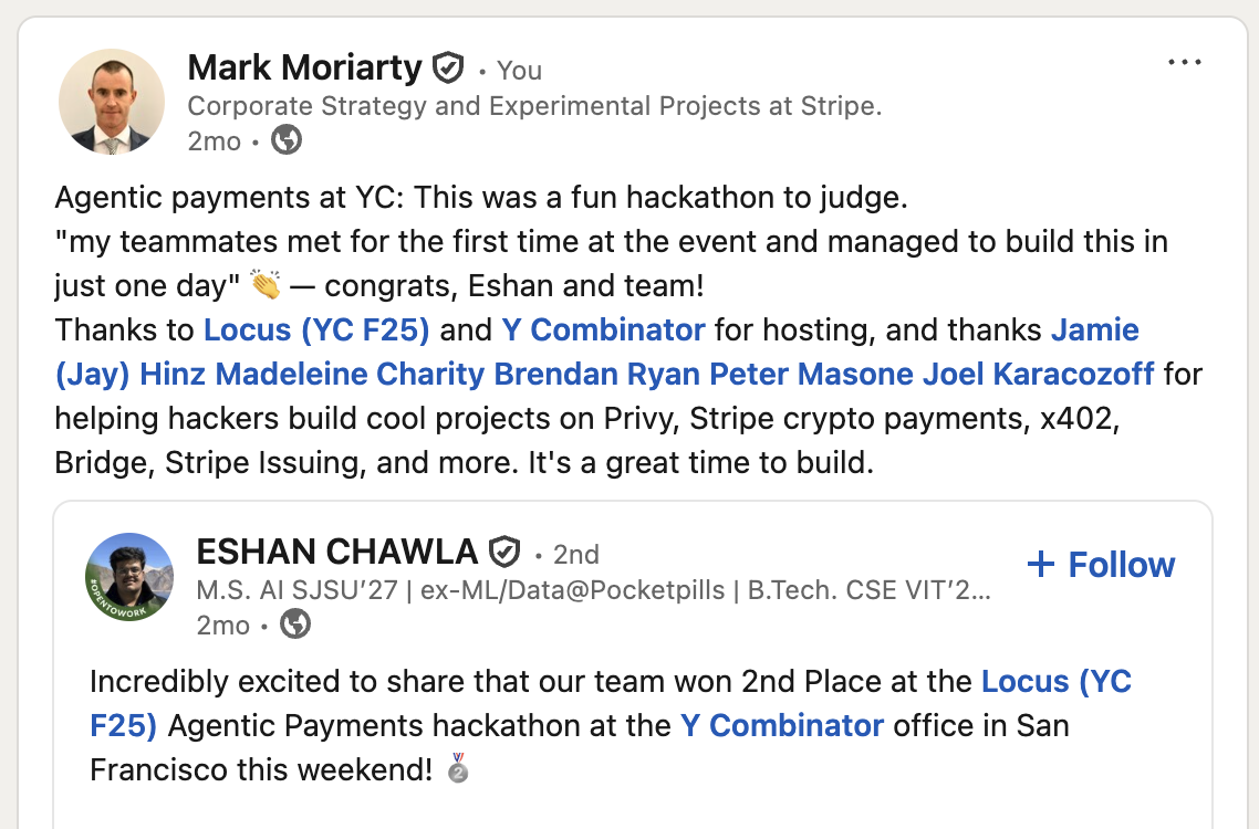 Last November, Stripe was a sponsor of the “Locus × YCombinator” Agentic Payments hackathon. Mr Moriarty was the sole Stripe judge for this exclusive hackathon held in YCombinator headquarters. Mr Moriarty: