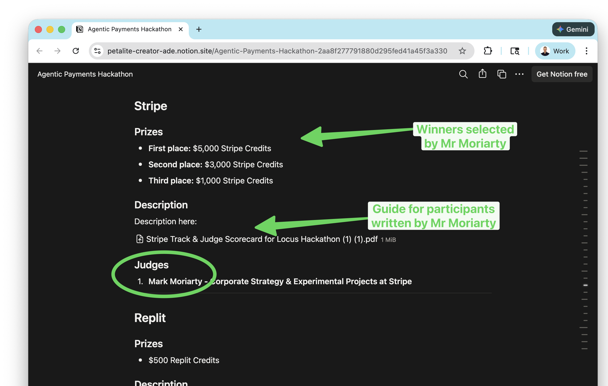 Here’s the Notion link(https://petalite-creator-ade.notion.site/Agentic-Payments-Hackathon-2aa8f277791880d295fed41a45f3a330) of all the tracks That site lists Mark Moriarty as the one judge representing Stripe.